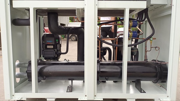 Pour le condenseur du refroidisseur refroidi par air, le ventilateur souffle de l'air extérieur relativement frais à travers les ailettes de dissipation thermique du condenseur, où le flux d'air échange de la chaleur avec le réfrigérant gazeux à haute température à l'intérieur des ailettes, emportant la chaleur du réfrigérant ; pour le condenseur du refroidisseur refroidi par eau, cependant, un échange de chaleur se produit entre l'eau de refroidissement en circulation et le réfrigérant, emportant la chaleur du réfrigérant, qui nécessite une tour de refroidissement à eau.